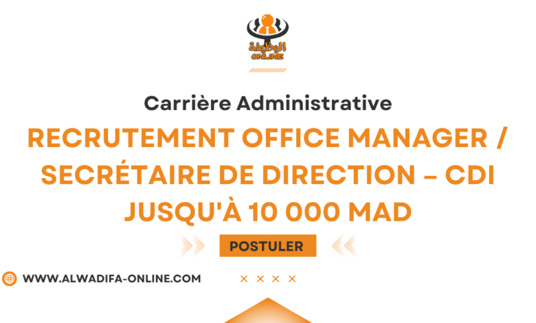 أكمل القراءة »Carrière Administrative: Recrutement Office Manager / Secrétaire de Direction – CDI jusqu’à 10 000 MAD Vous êtes organisé(e), discret(e) et…