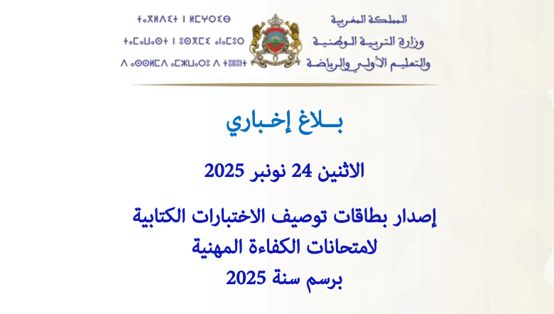 أكمل القراءة »توصيف الاختبارات الكتابية لامتحانات الكفاءة المهنية 2025/2026 امتحانات الكفاءة المهنية برسم سنة 2025 25 نوفمبر 2025مذكرة رقم 107-25 بتاريخ 14…