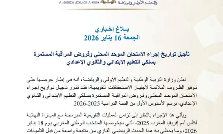 أكمل القراءة »تأجيل تواريخ إجراء الامتحان الموحد المحلي وفروض المراقبة المستمرة 2026 تأجيل تواريخ إجراء الامتحان الموحد المحلي وفروض المراقبة المستمرة بسلكي…