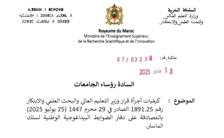أكمل القراءة »دفتر الضوابط البيداغوجية لسلك الماستر 2025-2026 كيفيات أجرأة قرار وزير التعليم العالي والبحث العلمي والابتكار رقم 1891.25 الصادر في 29…