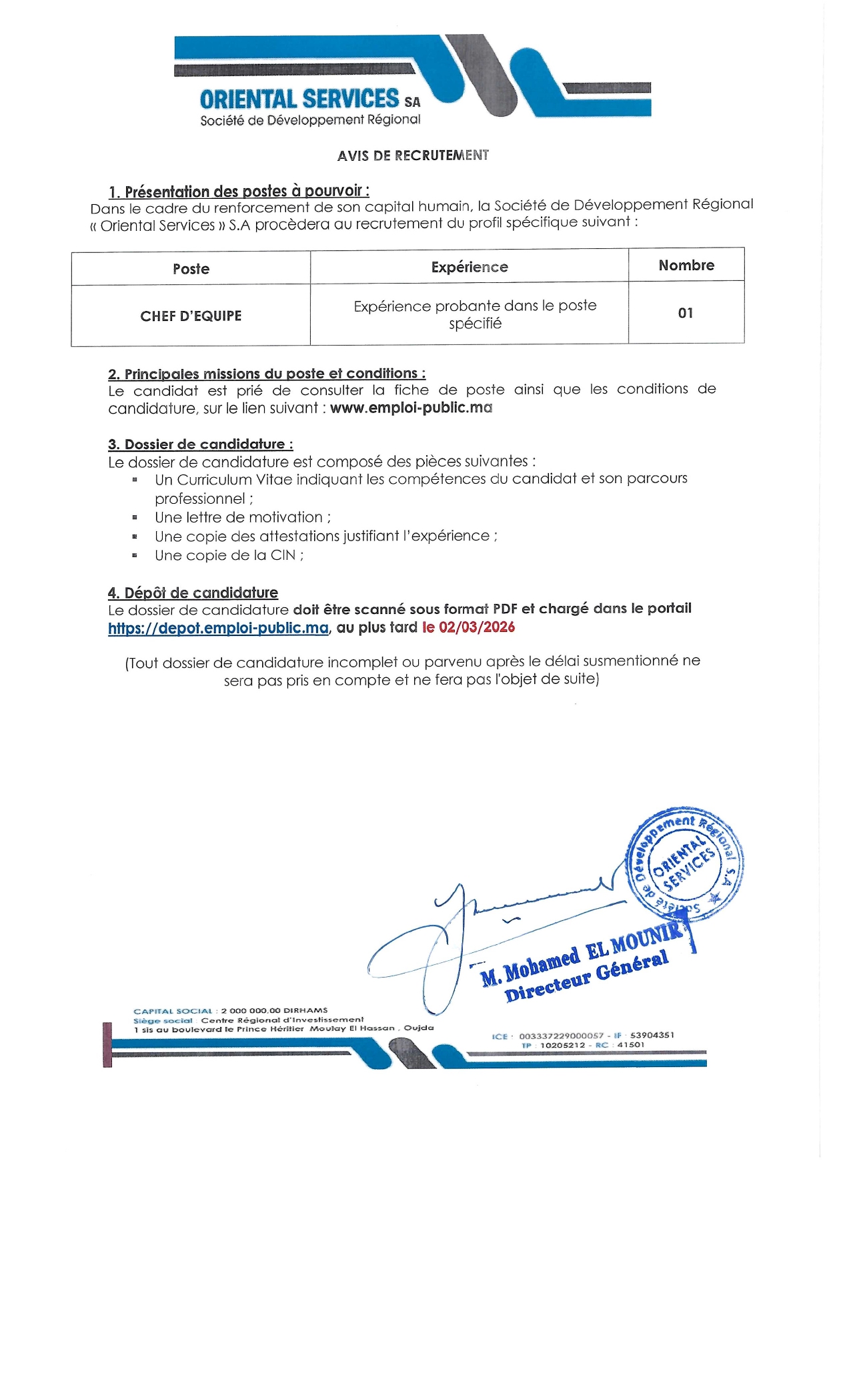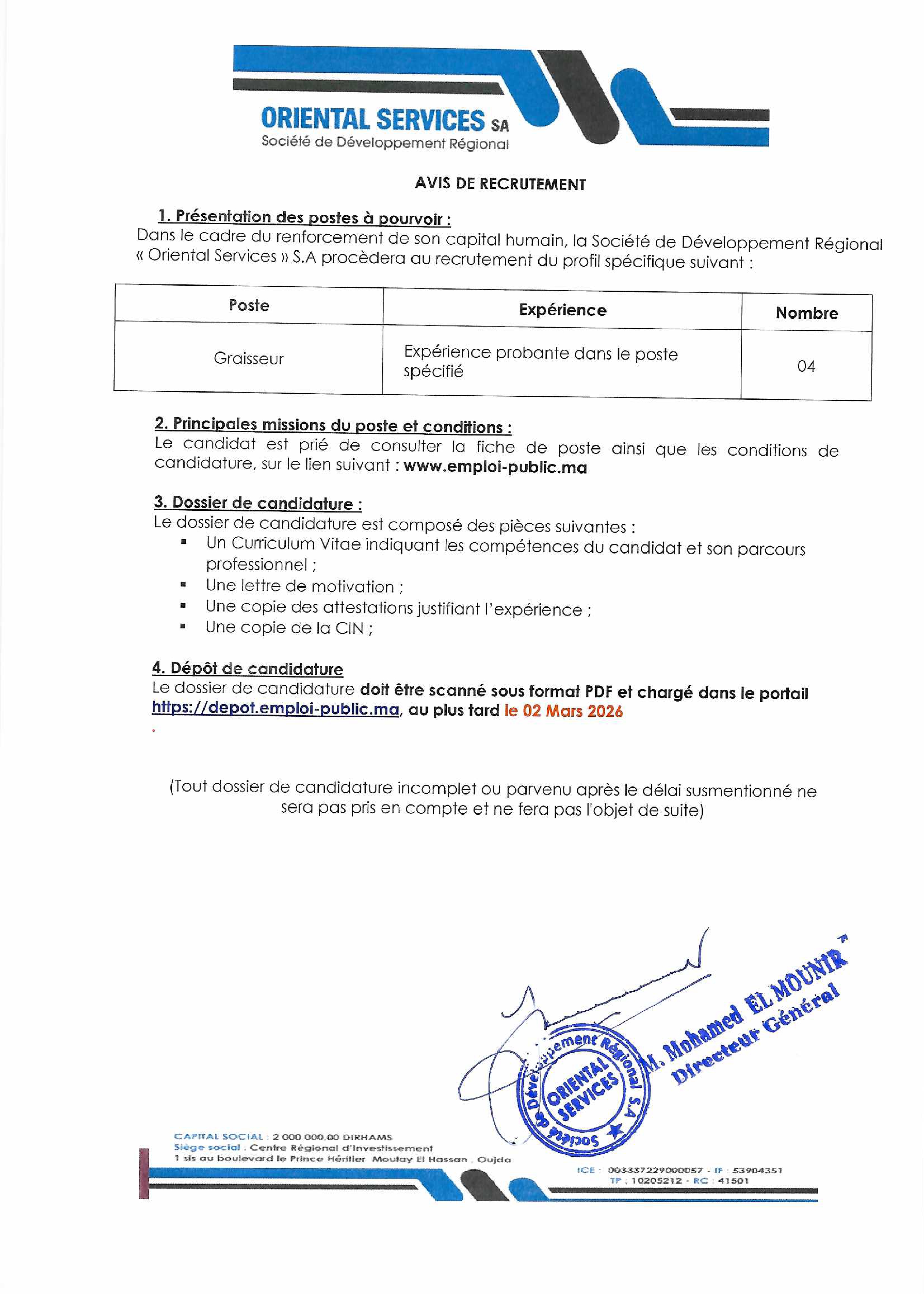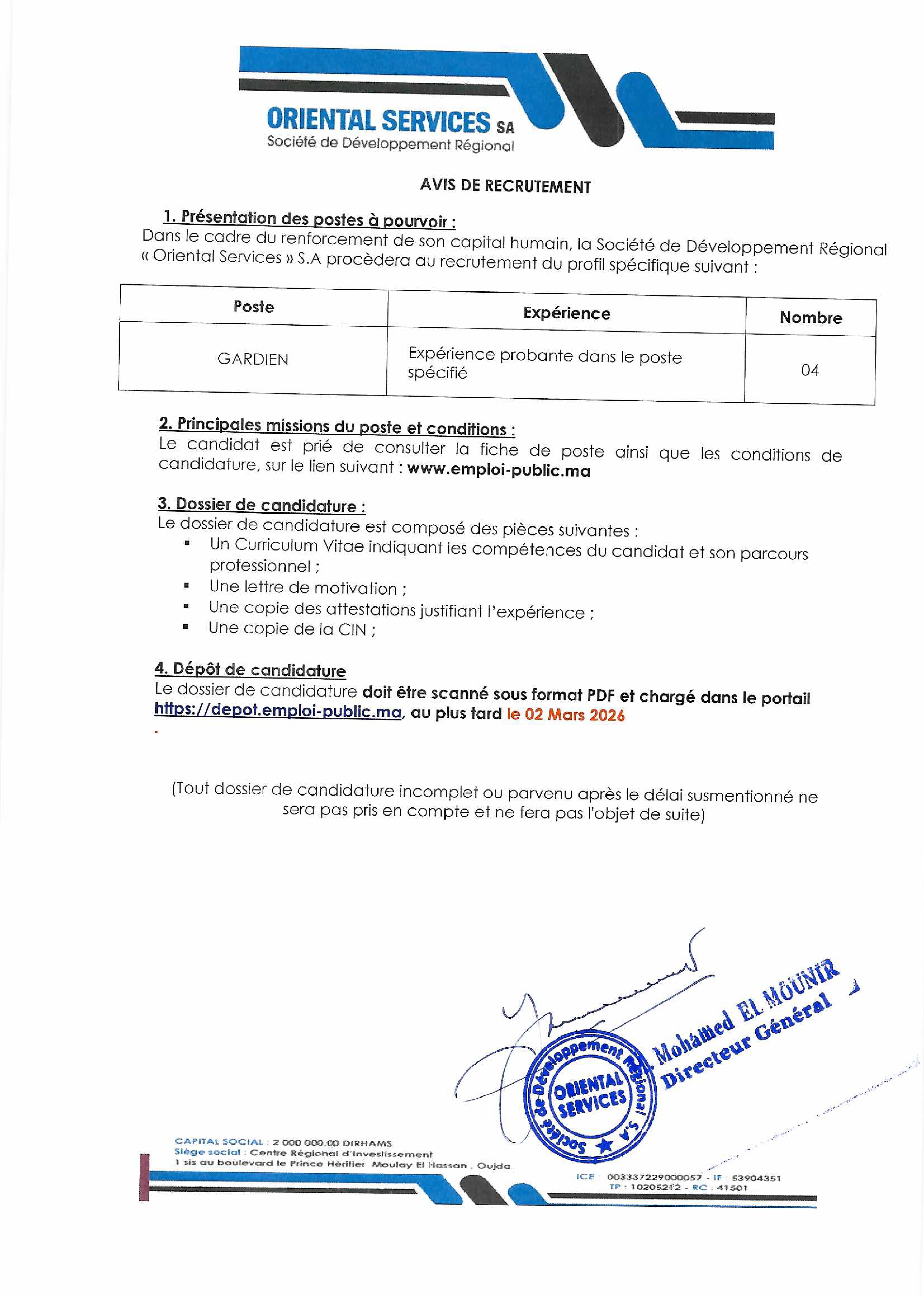 Concours de recrutement à la Société de Développement Régional “Oriental Services” au titre de l’année 2026.