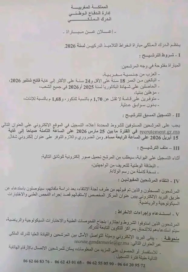 Concours Gendarmerie Royale Maroc 2026 : Concours de recrutement de (par contrat) Elève Gendarme au Administration de la défense nationale – Gendarmerie Royale.