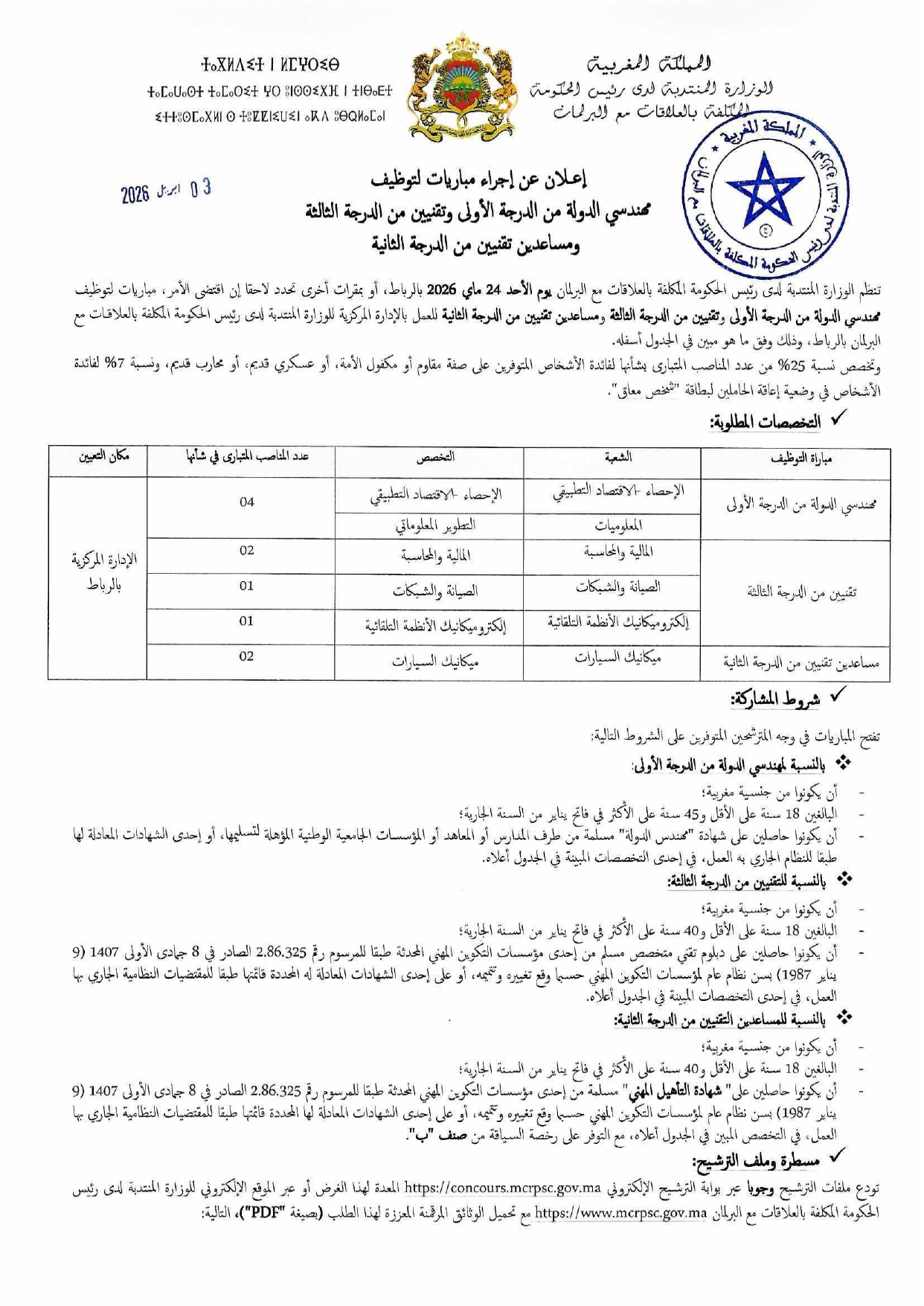 Concours Ministère chargé des relations avec le Parlement 2026 Concours de recrutement Ministère délégué auprès du chef du gouvernement chargé des relations avec le parlement.