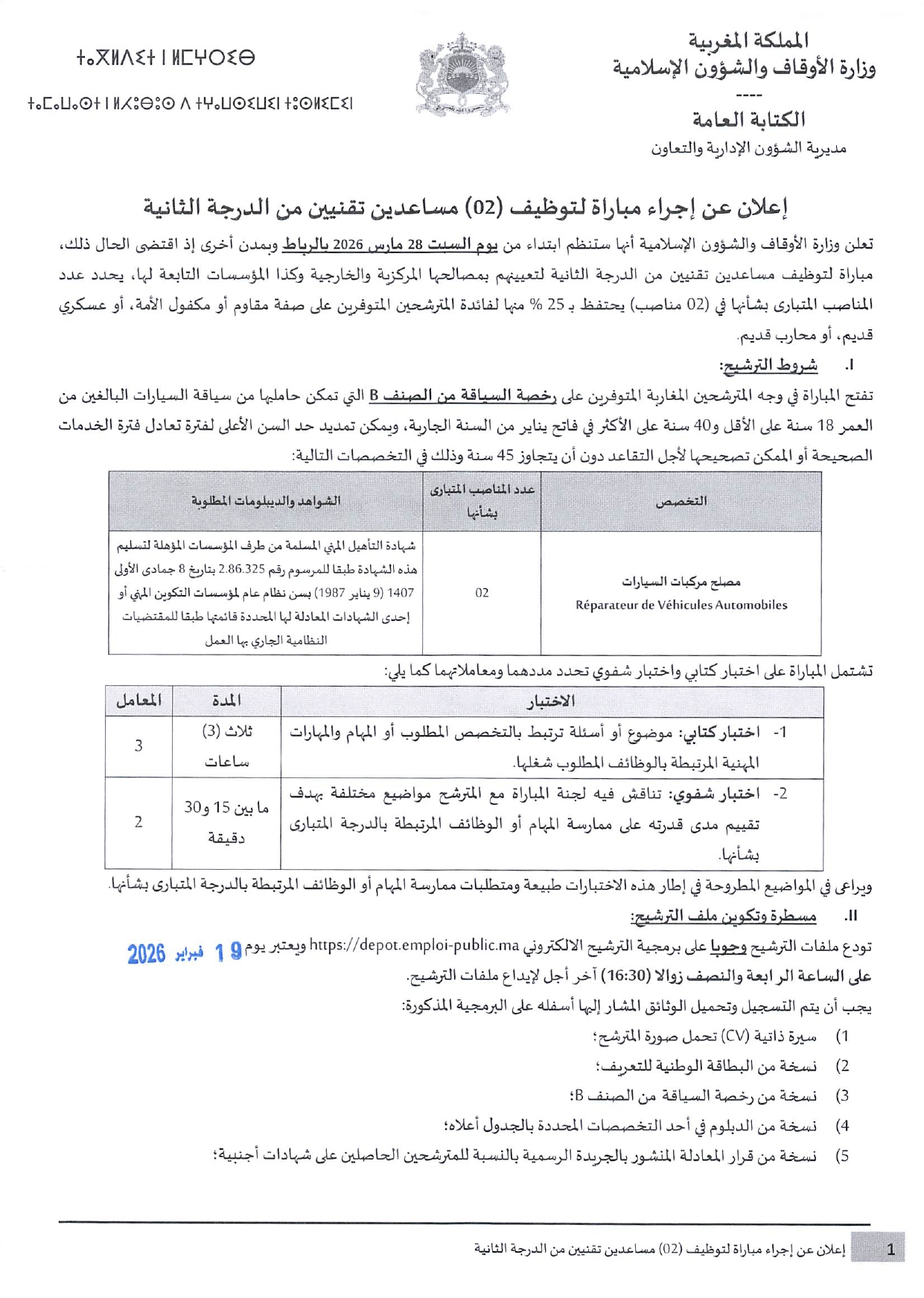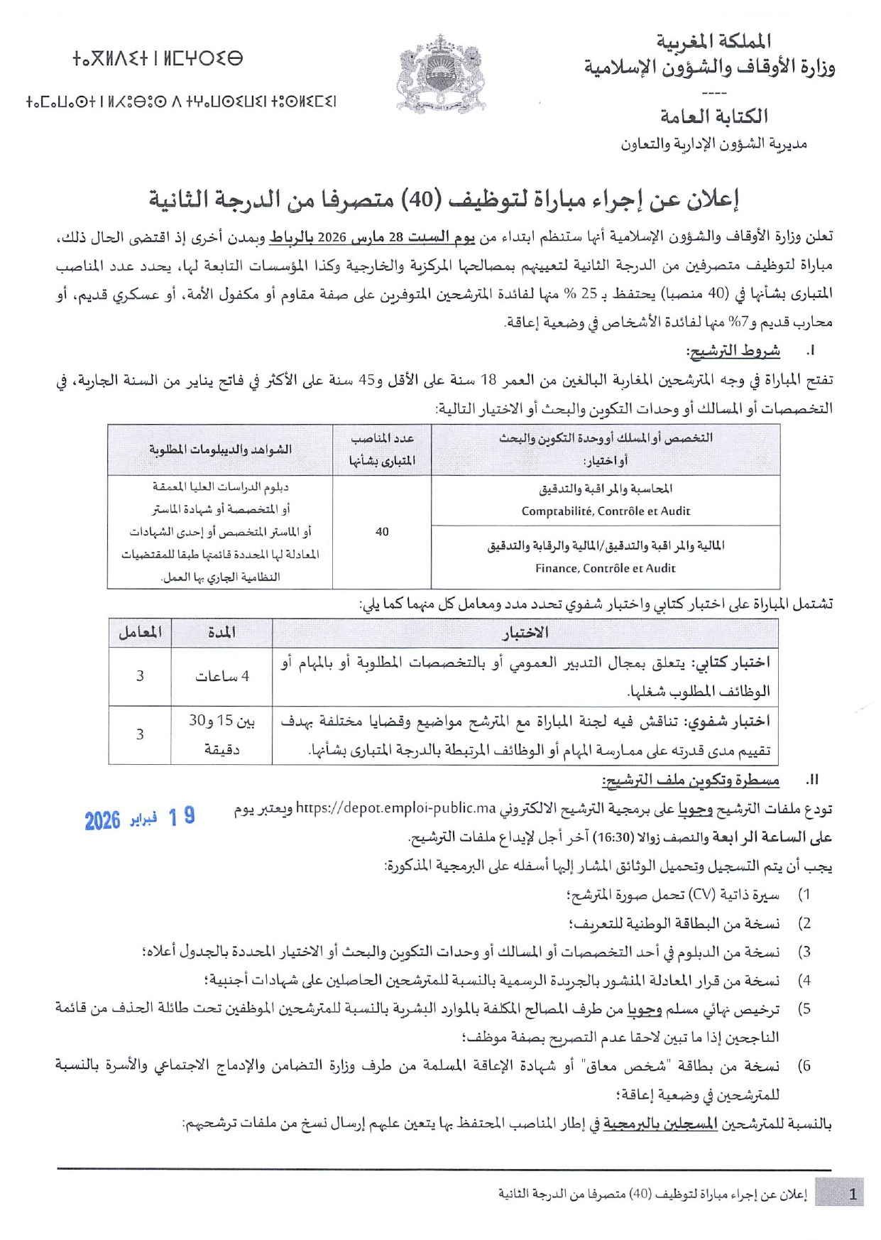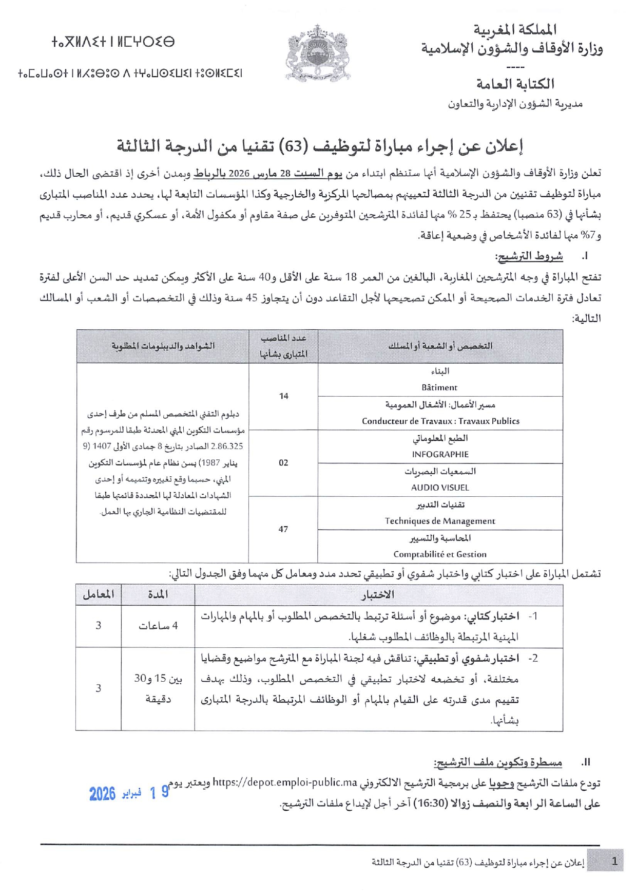 Concours de recrutement au Ministère des habous et des affaires islamiques 2026